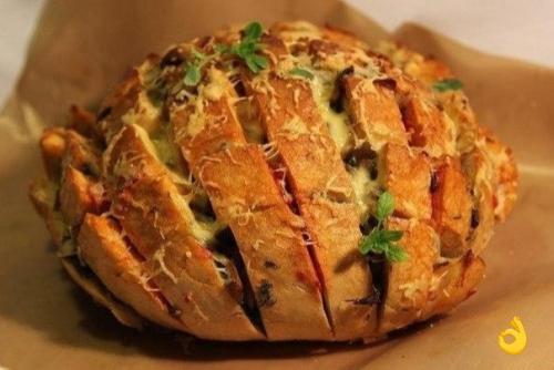 4. хлеб порезать сначала поперек, а потом вдоль, не дорезая до основания. Так, чтобы получилась решетка из квадратиков приблизительно 2 х 2 см.
