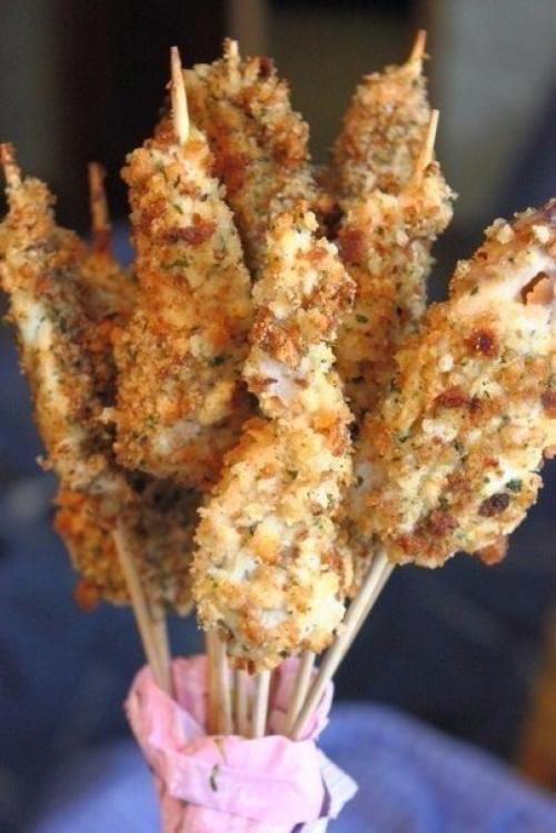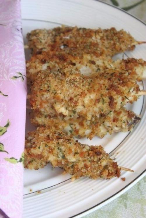 Обвалять ломтики курицы в панировке, нанизать на шпажки, выложить на противень (застеленный пекарской бумагой), запекать 15 минут. Быстро, вкусно! Пробуйте на здоровье!