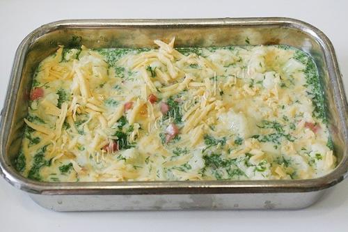 Отварную цветную капусту сложите в форму для запекания, сверху посыпьте лук и ветчину. Затем притрусите нарезанным укропом.