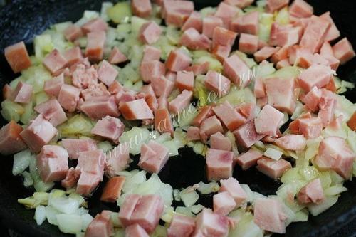 Лук мелко нарежьте. Ветчину нарежьте кубиками. Обжарьте на растительном масле лук до золотистого цвета, добавьте к луку ветчину и обжаривайте еще 1 минуту.