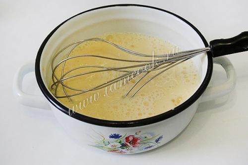 Приготовьте заливку. Для этого яйца взбейте венчиком, добавьте к ним молоко, пропущенный через пресс чеснок, немного посолите и еще немного взбейте венчиком.