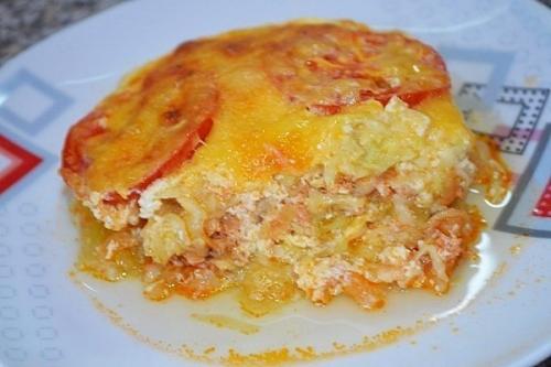5. на форму выложить половину кабачков, сверху фарш, затем опять кабачки. Выложить помидоры. Залить сметено - яичной смесью, посыпать тертым сыром.