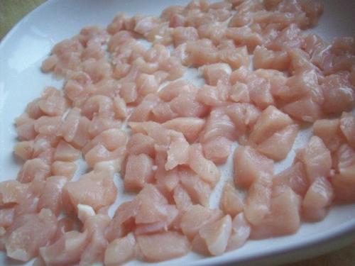 1. куриное Филе мы нарезаем мелко, как для куриных оладушек. Выкладываем в форму, слегка смазанную растительным маслом.