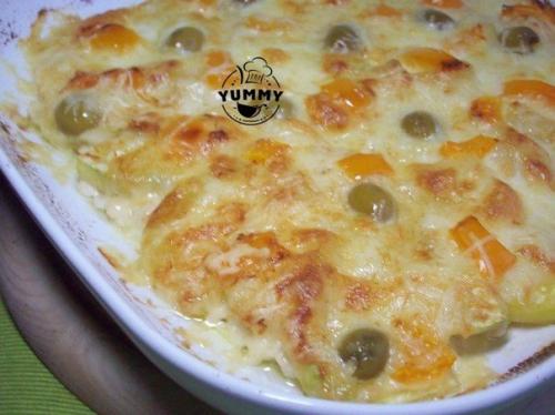 3. сверху на куриное Филе (которое нужно было посолить и поперчить) выкладываем ломтики обжаренного кабачка. Сверху - кусочки моцареллы. Посыпаем тертым пармезаном. Сверху кусочки болгарского перца и оливки выкладываем.