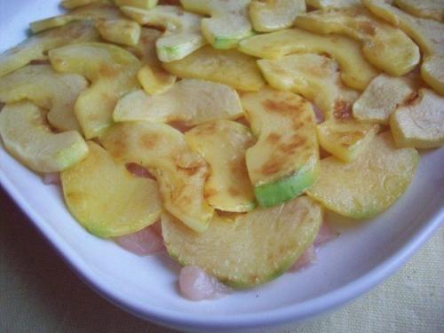 2. кабачок нарезаем небольшими ломтиками. Обжариваем слегка. Моцареллу нарезаем ломтиками. Пармезан натираем на тёрку. Перец режем небольшими кусочками.