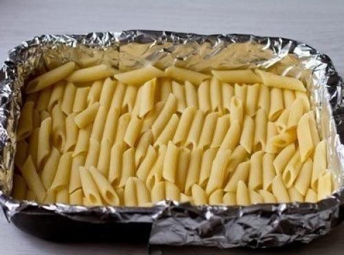 Собираем запеканку. На дно формы (у меня 35*24 см) кладем половину макарон.