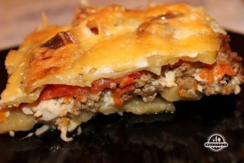 На дно формы выложить слой картошки. Затем слой фарша. На фарш выложить помидоры. Накрыть всё картошкой.