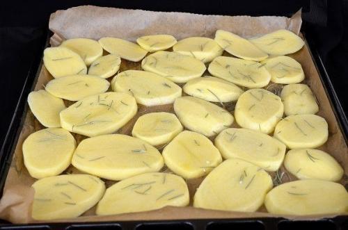 1. очищенный картофель нарезаем кружочками, выкладываем в миску, поливаем маслом, посыпаем солью и мы перемешиваем. Выкладываем подготовленные кружочки картофеля на противень с бумагой, посыпаем орегано.