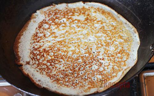- Печем блинные лепешки как обычно: наливаем на раскаленную сковороду немного теста, распределяем его тонким слоем по дну и припекаем с обеих сторон до румяности.