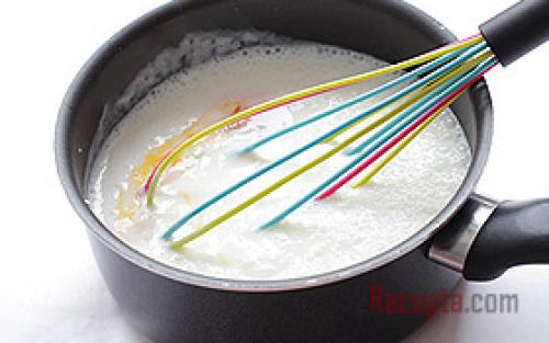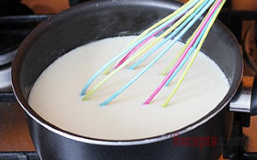 Затем кастрюлю поставить на огонь и немного нагреть (не кипятить!). Во время нагревания кефир постоянно помешивать.