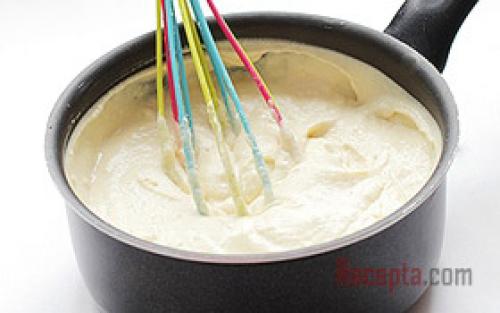 Соединив яйца с солью и подсластив их, взбиваем до легкого вспенивания. Далее доливаем «гоголь-моголь» молоком и сдабриваем топленым маслом.