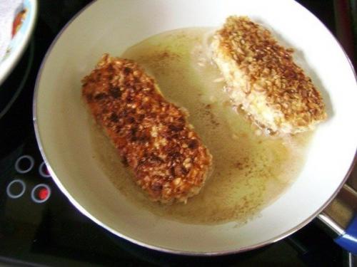 3. ломтик сыра окунать в яйца, затем в муку, затем снова в яйца и в хлопья. Хлопья прижимать к сыру хорошенько.