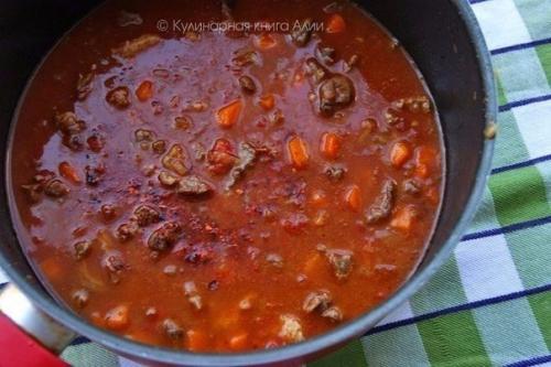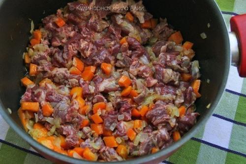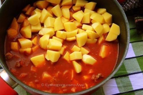 Потушить вместе недолго. Добавить мясо, порезанное небольшими кусочками. Тушить до готовности мяса, если надо подливая водички. Добавить порезанный на маленькие кусочки помидор (кожицу желательно убрать. Мы тушим минут 10. Доливаем воды, чтобы покрыло мясо с овощами, добавляем соль, я еще острую паприку добавила. Затем добавляем картофель, порезанный брусочками. Варим до готовности картофеля.