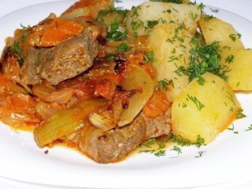 . На мясо выложить нарезанный кубиками картофель, залить водой почти всю картошку, посолить, поперчить. Тушить под крышкой до готовности картофеля. Помидоры нарезать кубиками и добавить в жаркое. Добавить лавровый лист и тушить ещё 10 минут. Когда жаркое будет готово, лавровый лист убрать. При подаче посыпать зеленью. Приятного аппетита! Сохрани рецепт, чтобы не потерять!