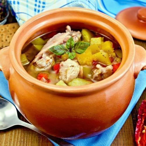 12. выпекать жаркое при температуре 200 градусов в течение 30-35 минут, накрыв горшочек крышкой. 13. Спустя полчаса после начала выпекания вынуть горшочки из духовки, посыпать жаркое тёртым сыром, затем вернуть в духовку.