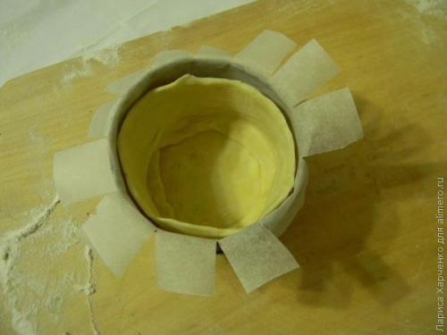 Теперь в форму выкладываем сначала донышко (бумагу и кружочек теста), а потом по кругу аккуратно прищипываем прямоугольник, вырезанный из теста (ну и бумаги, конечно.