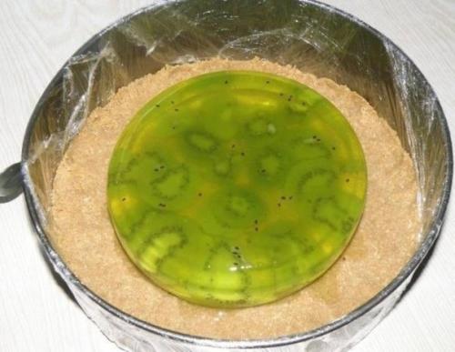 3. форму для выпечки застелила пищевой пленкой. На дно выложила тесто и распределила его по всей поверхности, хорошо придавливая. Далее далее поставила в холодильник. . пакетированное желе развела по инструкции, залила в посудину, которая по форме напоминала форму для выпекания, но при этом была ниже и меньше по объему. Поставила поставила застывать в холодильник. . через некоторое время добавила нарезанное дольками киви. Именно именно это и стало моей ошибкой. киви и ананас нельзя добавлять свежими в желе, так как они нейтрализуют действие желатина.