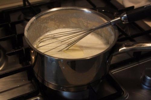 4. приготовить соус "Бешамель". Молоко нагреть, по столовой ложке добавлять муку и перемешивать венчиком, чтобы не образовалось комков. В конце добавить масло, перец и соль. Тщательно перемешать. Соус готов.