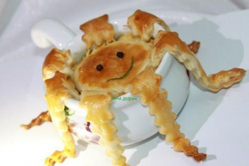Увидев в инете интересное оформление жюльена, естественно захотелось повторить. Только должен был получиться осьминожек, а вышло на подобие солнышка. Ну и ладно, зато вызвало улыбку на лице моих домашних?