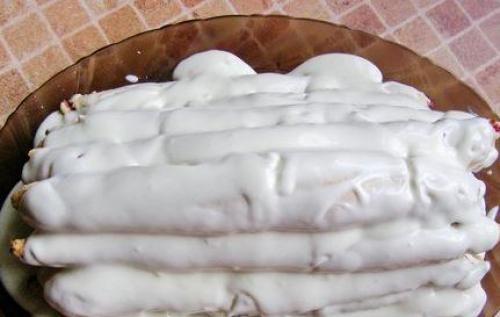 14 после чего кладем 4 трубочки и снова заливаем кремом, после три и две, а в конце 1 трубочку кладём, и весь торт обильно заливаем сметанным вкусным кремом. Вот и готова "Крыша".