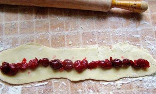 9 из кусочков, которые по одному достаём из морозильника, раскатываем прямоугольники длиною с противень, выкладываем в рядок вишню.